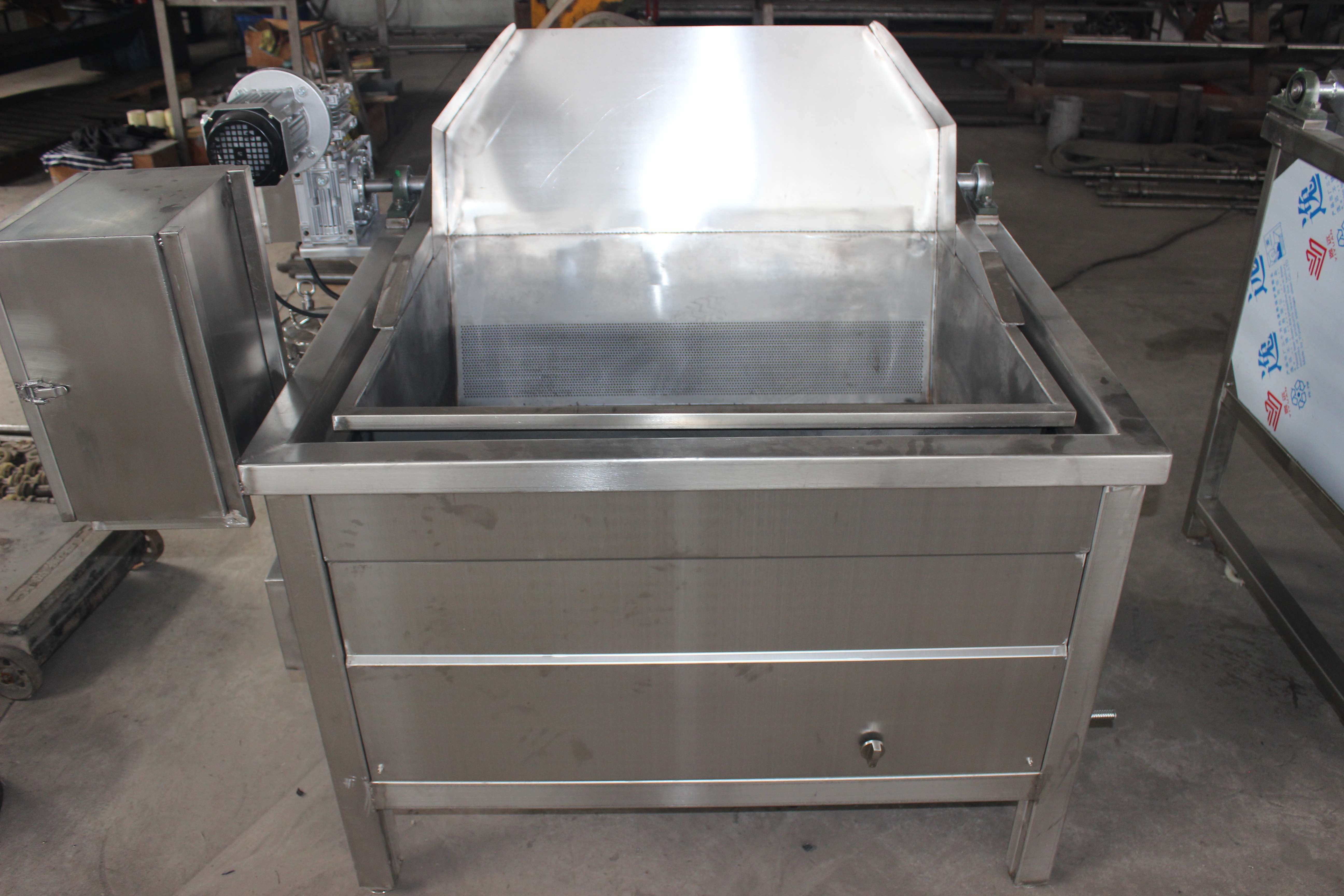 Equipment introduction: The main material of the equipment is food-grade 304 stainless steel. Frying basket size: 1000*800*350mm, frying basket hole size: 3mm, oil capacity: 250L (capacity during normal frying). The equipment is equipped with an automatic discharging system, heating system, automatic temperature control system, high-temperature warning and power-off system, heat preservation system, control system, and button operation mode. It adopts gas fire row heating, featuring fast temperature rise, low energy consumption, no residue burning, and long service life. 1. Product Name